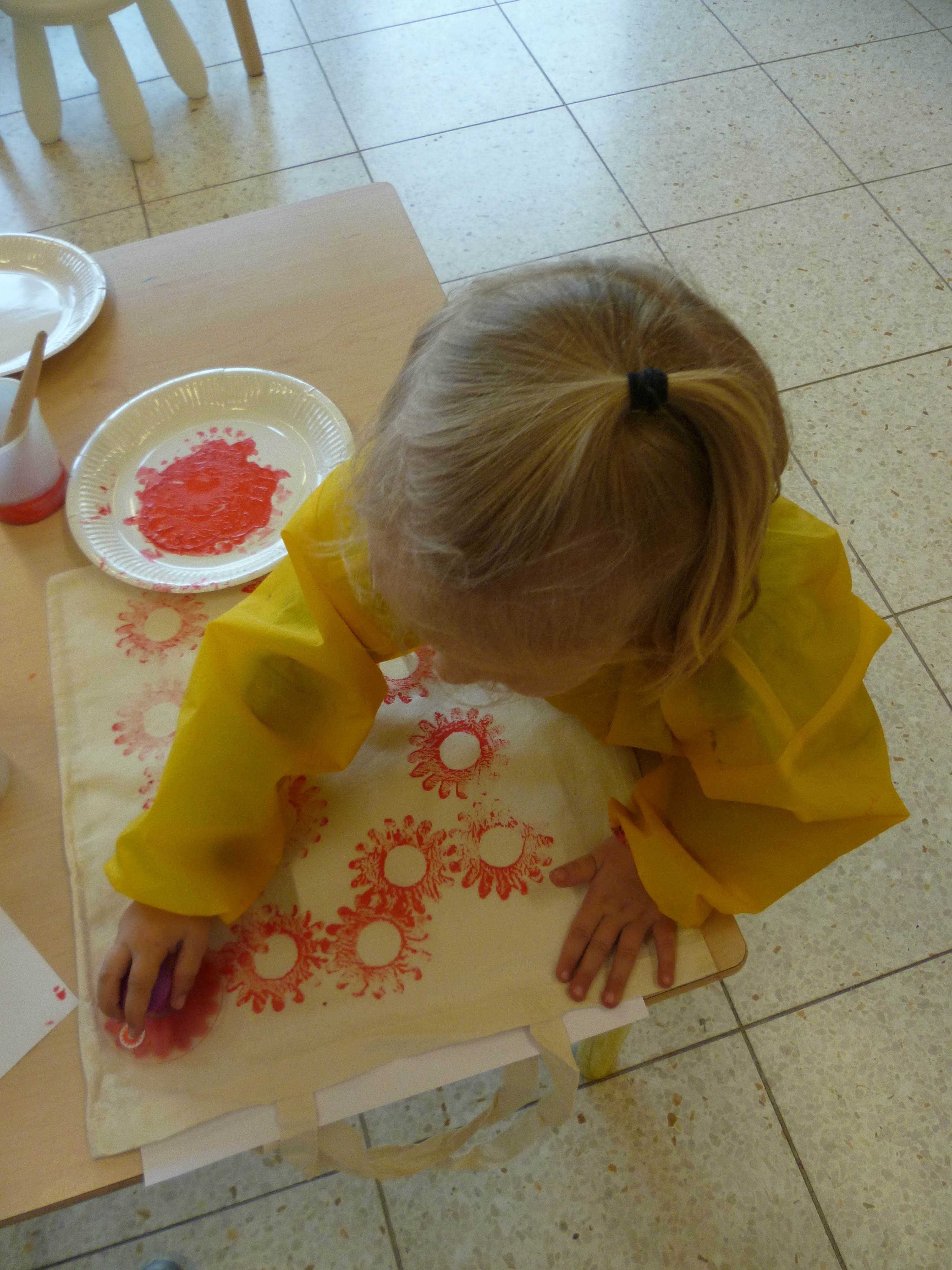 We begonnen ook met het knutselen van een cadeautje voor mama. We mochten op een stoffen tas onze handjes afdrukken, in de vorm van een bloem.
